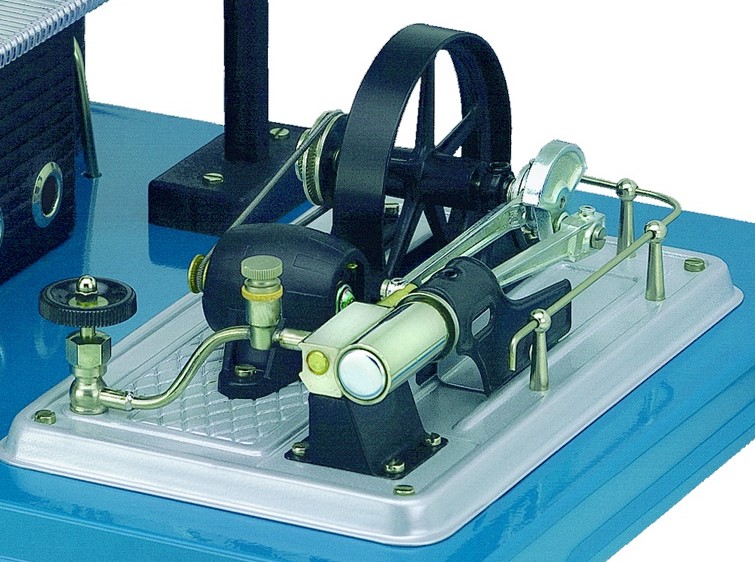 Wilesco D18Das voll funktionsfähige Dampfmaschinenmodell D18 der Firma Wilesco zeigt im kleinen Maßstab eindrucksvoll wie, aus Wasserdampf, elektrischer Strom gewonnen werden kann. In den Kessel des Kesselhauses wird Wasser eingefüllt und mittels Trockenbrennstoff erhitzt. Sobald der Dampfdruck im Kessel eine vorgegebenen Wert ereicht hat, kann das Stellventil geöffnet werden. Der heiße Dampf wird dadurch in den Zylinder geleitet. Auf die gleiche Art wie im Kapitel Funktionsweise beschrieben, setzt sich der Kolben und damit das Schwungrad in Bewegung. Über einen Transmissionsriemen wird ein kleiner Dynamo angetrieben. Dieser erzeugt genügend elektrische Leistung, um eine Lampe, welche auf der Grundplatte montiert ist, leuchten zu lassen. Falls gerade einmal keine Steckdose vorhanden ist, könnte man auch einfach ein Handy laden! Siehe Video-Link.
