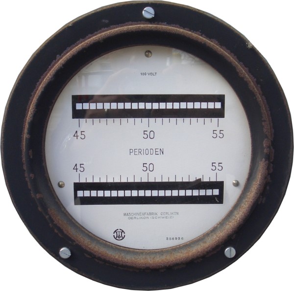Doppelfrequenzmessgerät MFO 1930Erhalten geblieben ist auch ein Steuerschrank mit diversen Messgeräten. Diese Einrichtung diente dazu die Anlage während des Betriebes zu kontrollieren. Es finden sich Messgeräte für Strom, Spannung, Leistung und ein sogenannter Doppelfrequenzmesser (Zungenfrequenzmesser). Dieses wichtige Messgerät wurde benötigt, um den Generator auf das öffentliche Stromnetz aufschalten zu können. Bevor eine Drehstrom-Synchronmaschine ihre Energie in das öffentliche Stromnetz einspeisen kann, sind bestimmte Synchronisationsbedingungen (auch Parallelschaltbedingungen) einzuhalten. Dazu gehört, das die Frequenz der Anlage exakt mit der des zu speisenden Netzes übereinstimmt (50Hz). Ist dies nicht der Fall, "zieht" das Netz den Generator schlagartig mit und es entstehen sehr große Kräfte (Momente). Diese wirken auf die Maschine und das Maschinenfundament. Große Schäden oder sogar die Zerstörung wären die Folge. Grund: Ein einzelner Synchrongenerator wäre wohl kaum in der Lage seine Drehzahl allen angeschlossenen Kraftwerken "aufzuzwingen"! (Wasser-Kohle-Atom). Der exakte Gleichlauf wurde mit Hilfe des Doppel-Frequenzmessgeräts (Synchronoskop) überprüft. Die Regulierung der Drehzahl erfolgte manuell über die Stellräder der Dampfmaschine. In modernen Anlagen wird nicht mehr von Hand synchronisiert. Diese Aufgabe wird in Kraftwerken von der Leittechnik übernommen und bedarf, außer der Auslösung, keines menschlichen Eingriffs mehr. Im Falle unserer Solaranlage übernimmt diese Funktion der Wechselrichter.