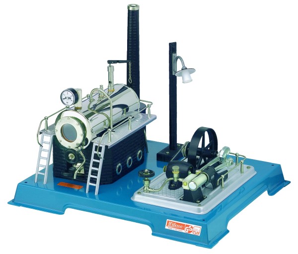 Wilesco D18Das voll funktionsfähige Dampfmaschinenmodell D18 der Firma Wilesco zeigt im kleinen Maßstab eindrucksvoll wie, aus Wasserdampf, elektrischer Strom gewonnen werden kann. In den Kessel des Kesselhauses wird Wasser eingefüllt und mittels Trockenbrennstoff erhitzt. Sobald der Dampfdruck im Kessel eine vorgegebenen Wert ereicht hat, kann das Stellventil geöffnet werden. Der heiße Dampf wird dadurch in den Zylinder geleitet. Auf die gleiche Art wie im Kapitel Funktionsweise beschrieben, setzt sich der Kolben und damit das Schwungrad in Bewegung. Über einen Transmissionsriemen wird ein kleiner Dynamo angetrieben. Dieser erzeugt genügend elektrische Leistung, um eine Lampe, welche auf der Grundplatte montiert ist, leuchten zu lassen. Falls gerade einmal keine Steckdose vorhanden ist, könnte man auch einfach ein Handy laden! Siehe Video-Link.